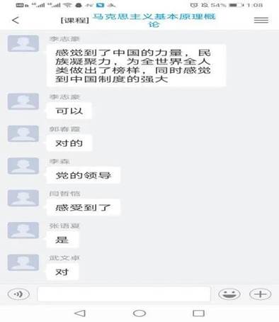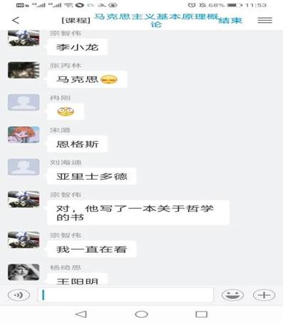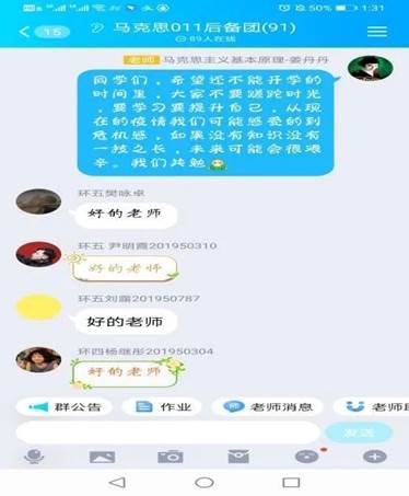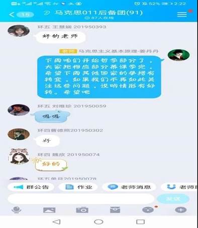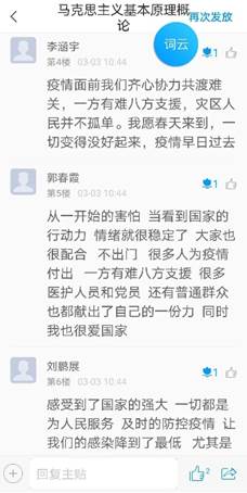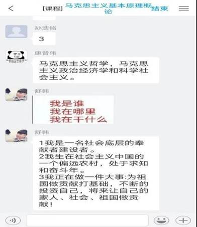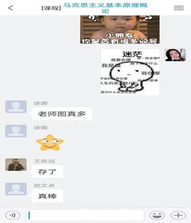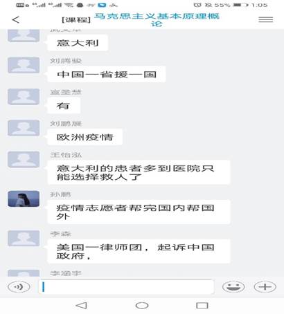 延期开学不停课,教学质量不降低。思政课是公司落实立德树人根本任务的关键课程,思政人使命光荣,责任重大。在防控疫情的特殊时期,思政课的育人责任更为突出,如何上好思政课,是每位思政课教师都在思考和探索的问题。在线上教学开学前,通过多次与院领导和老师们的数次交流和商议,我任教的“马克思主义基本原理概论”课选取了超星学习通的优质资源课程,并自建了翻转课堂以进行集中辅导,通过上传丰富的教学资料、ppt、视频案例等充实教学资源。几周的全网教学,在云端课堂上既有同学们的欢声笑语,也有同学们的大人模样,更有同学们对事物的深刻思考,还收获了同学们的认同和赞扬。