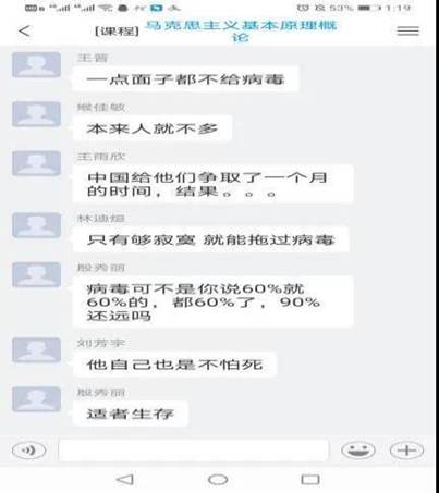 疫情中的一些人和事不仅仅是思政课的鲜活案例,也深深牵动着我的心,疫情爆发时为国家、为人民、为我的员工们忧心挂念。中国疫情好转时,我心疼祖国刚刚在战“疫”中松了口气又去国际上支援帮助。两次课上与同学讨论相关话题都有些哽咽,下课后平复了一下心情,我为同学留下了这样的话。
