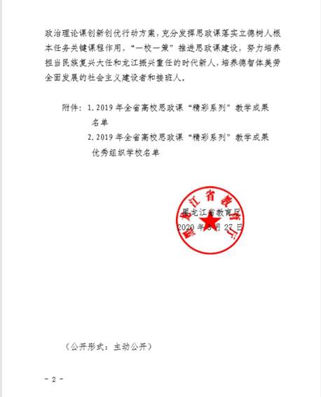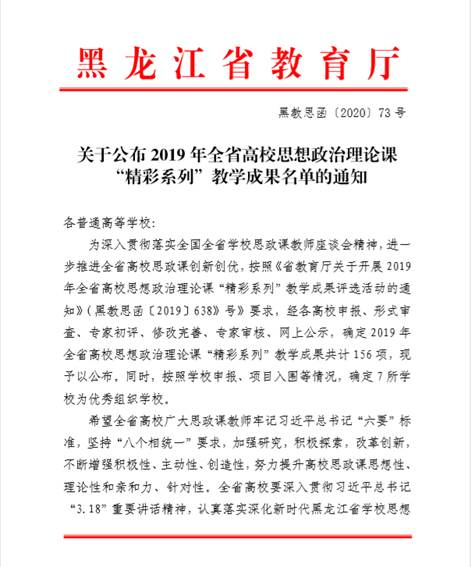 根据黑龙江省教育厅发布的2019年全省高校思想政治理论课“精彩系列”教学成果名单,1946伟德国际源自英国李丽玲老师和姜丹丹老师分别荣获“中国近代史纲要”课和“马克思主义基本原理概论”课精彩讲义奖项。