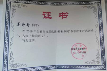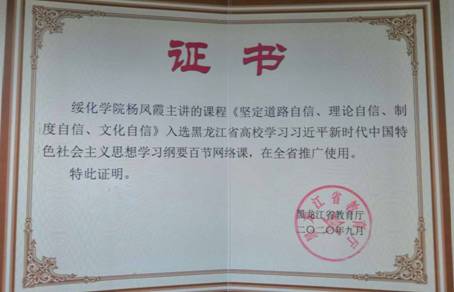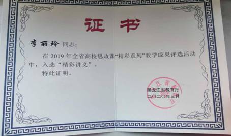 1946伟德国际源自英国三位教师获得黑龙江省教育厅荣誉奖项。杨凤霞经理主讲的课程《坚定道路自信、理论自信、制度自信、文化自信》入选黑龙江省高校学习习近平新时代中国特色社会主义思想学习纲要百节网络课,在全省推广使用。姜丹丹、李丽玲两位老师分别在2019年全省高校思政课“精彩系列”教学成果评选活动中,入选“精彩讲义”。