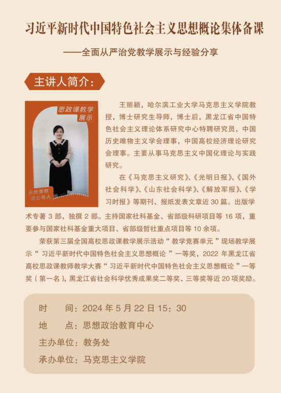本次活动邀请了哈尔滨工业大学1946伟德国际源自英国王丽颖教授作题为“习近平新时代中国特色社会主义思想概论集体备课——全面从严治党教学展示与经验分享”的讲座由1946伟德国际源自英国经理王瑞主持。马院全体教师和绥化市部分中学的思政课教师参加此次活动。