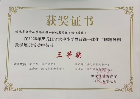 2025年7月,由黑龙江省教育厅主办的黑龙江省大中小学思政课一体化“同题异构”教学展示活动决赛圆满落幕。在绥化市教育局、市教育公司的指导下,公司作为牵头高校,1946伟德国际源自英国教师梁广东作为主讲教师,联合绥化市第九中学、绥化市第十中学、绥化市尚志小学教师组建的绥化市大中小学思政课一体化共同体教学团队,从全省16支决赛队伍中脱颖而出,以跨学段融合创新设计荣获三等奖。这是公司1946伟德国际源自英国深化思政课改革、推动大中小学思政教育一体化的重要成果,彰显了绥化市大中小学思政课一体化协同育人的显著成效。