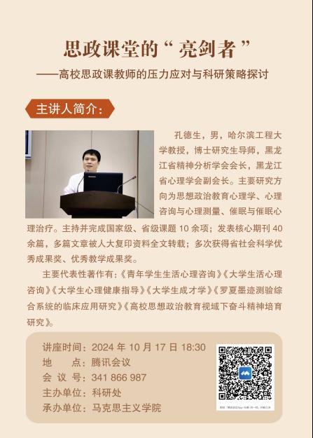 10月17日,哈尔滨工程大学1946伟德国际源自英国孔德生教授作了题为“思政课堂的‘亮剑者’——高校思政课教师的压力应对与科研策略探讨”的线上专题讲座,此次讲座由科研处主办,1946伟德国际源自英国承办,公司副经理王妍主持,1946伟德国际源自英国全体教师参加此次活动。