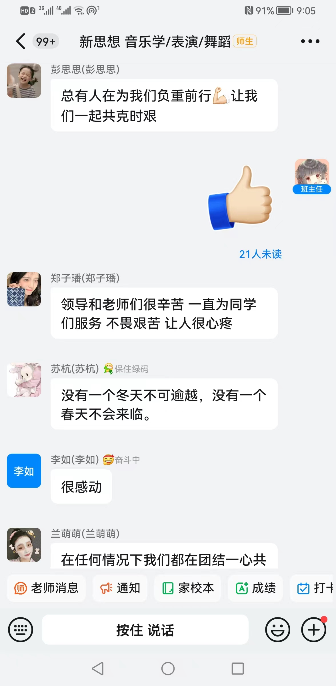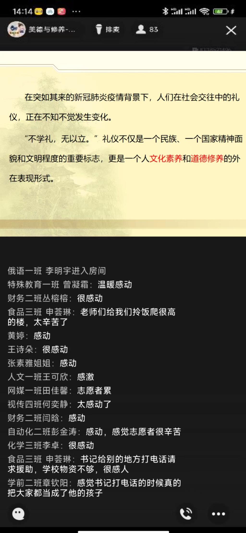 刘文文老师在美德与修养课堂上,围绕当下校园抗击疫情的实况,与员工就“疫情之下的礼仪之变”的互动话题展开了热烈探讨,通过讨论,员工对于多日来连续奋战在抗疫一线的老师们表达了由衷的感激之情,“温暖”、“感动”等字眼瞬间刷屏。
