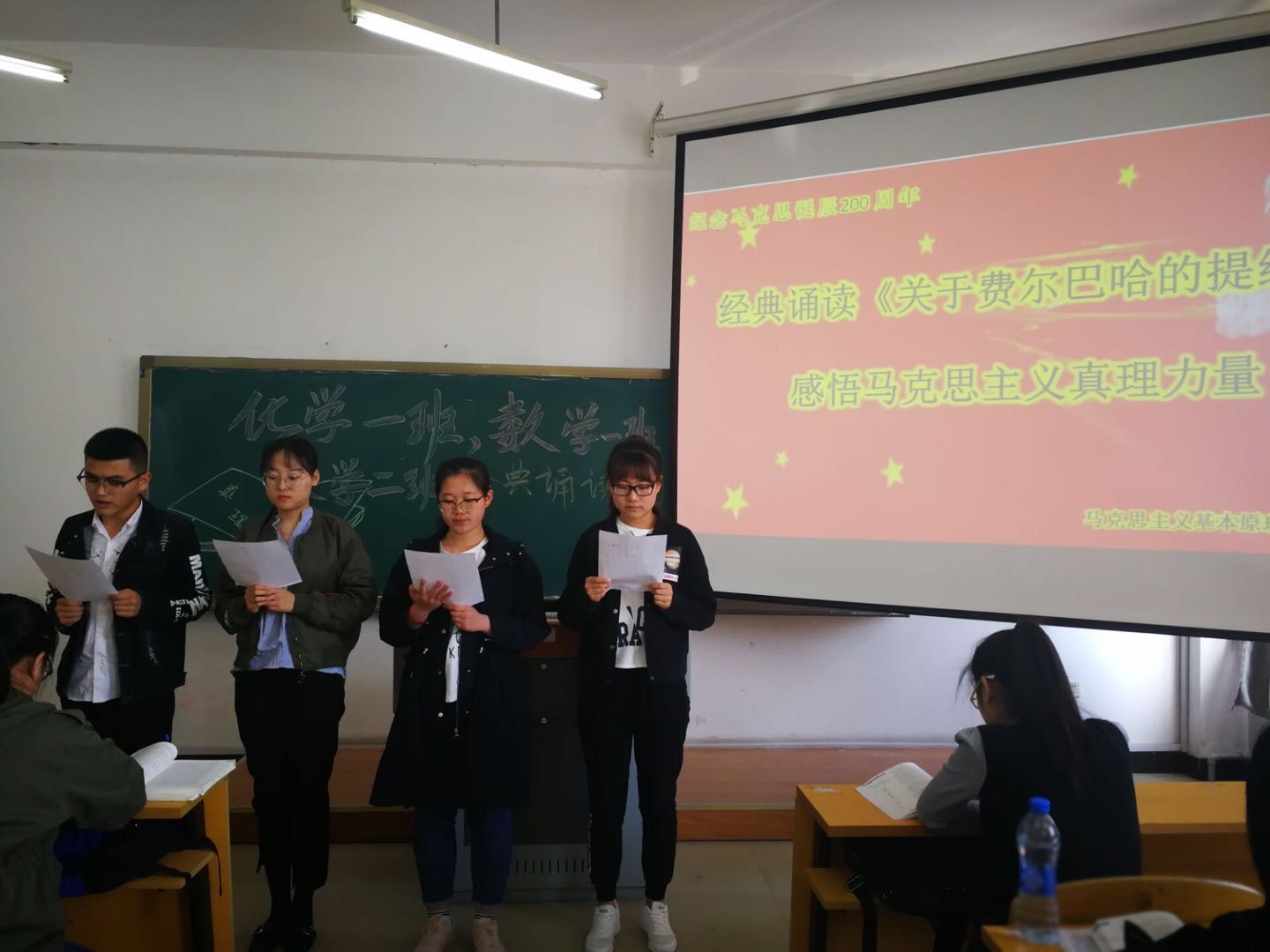 5月4日,思政部全体教师集体收看了纪念马克思诞辰200周年纪念大会的直播实况。会后,全体教师结合纪念大会上习近平总书记的重要讲话精神,在本周的思想政治理论课上开展了“纪念马克思诞辰200周年”经典诵读活动。