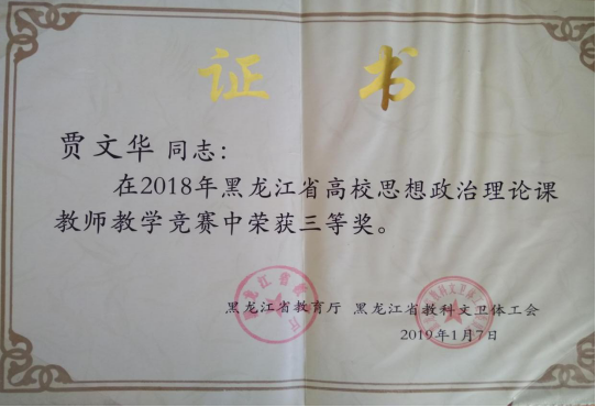 为深入贯彻落实全国教育大会和全国及全省高校思想政治工作会议精神,不断提高我省高校思想政治理论课教学水平,黑龙江省教育厅和黑龙江省教科文卫体工会于2018年12月在哈尔滨师范大学联合组织举办了全省高校高思想政治理论课教师教学竞赛,12月21日比赛落下帷幕,公司思政部贾文华老师获得此次竞赛三等奖。