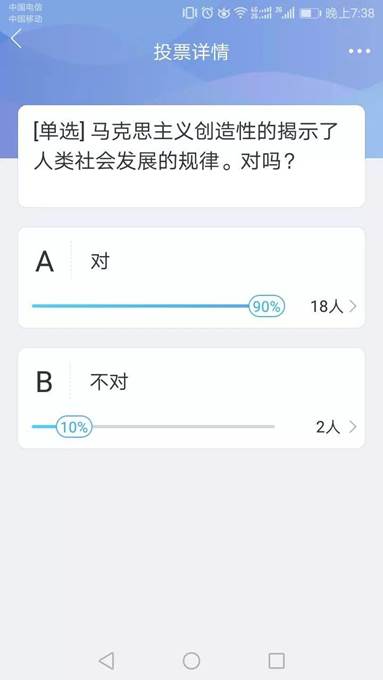 3月2日,开学第一节课,让我没想到的是全班出勤率100%,就连没有网络的同学也没有落下,而且全程都很认真的参与到教学的每一个环节中。在课堂讨论环节,我设计了问题:这场战役中,你印象最深的是什么?全班20人,都积极主动思考,“说”出自己的感悟。在课堂答疑环节中,同学们都提出自己学习中的困惑,互相解答。虽然有的回答不是很准确,但看得出大家都在认真思考。在投票环节中,我设计了判断题,巩固知识点。