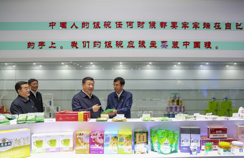 在一楼展示大厅,当地出产的米油豆奶等各类农产品琳琅满目,习近平逐一察看,强调中国人的饭碗任何时候都要牢牢端在自己的手上。他双手捧起一碗大米,意味深长地说道:“中国粮食!中国饭碗!”