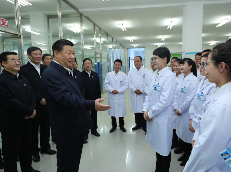 9月25日至28日,中共中央总书记、国家主席、中央军委主席习近平在东北三省考察,主持召开深入推进东北振兴座谈会。这是25日下午,习近平在黑龙江北大荒建三江国家农业科技园区,与正在实验室工作的科研人员亲切交谈。新华社记者 鞠鹏 摄